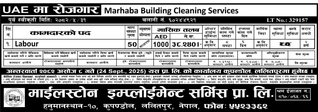 Milestone Employment Service Pvt. Ltd. is one of the top employment agency in Nepal, duty accredited by, Department of Labor & Transport Management, Ministry of Nepal. We are currently engaged in supplying unskilled, semi-skilled and skilled professionals in Asia, Europe and in the Gulf regions.